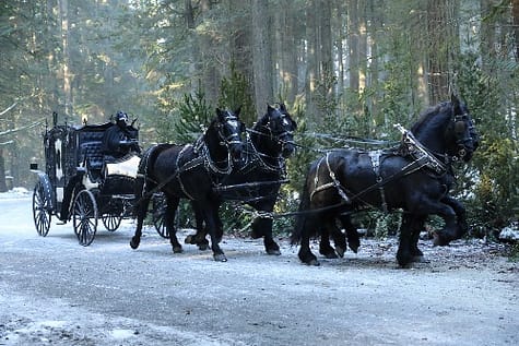 This is in Once Upon a Time; the mood is dark and scary. This is the Evil Queen’s carriage, so she need’s dark horses to cast the mood to make it more interesting and gloomy.